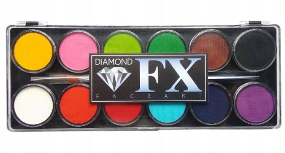 PALETA FARB DO MALOWANIA TWARZY I CIAŁA Diamond FX 12 kolorów podstawowych po 10 g + 2 pędzle płaskie i okrągłe.